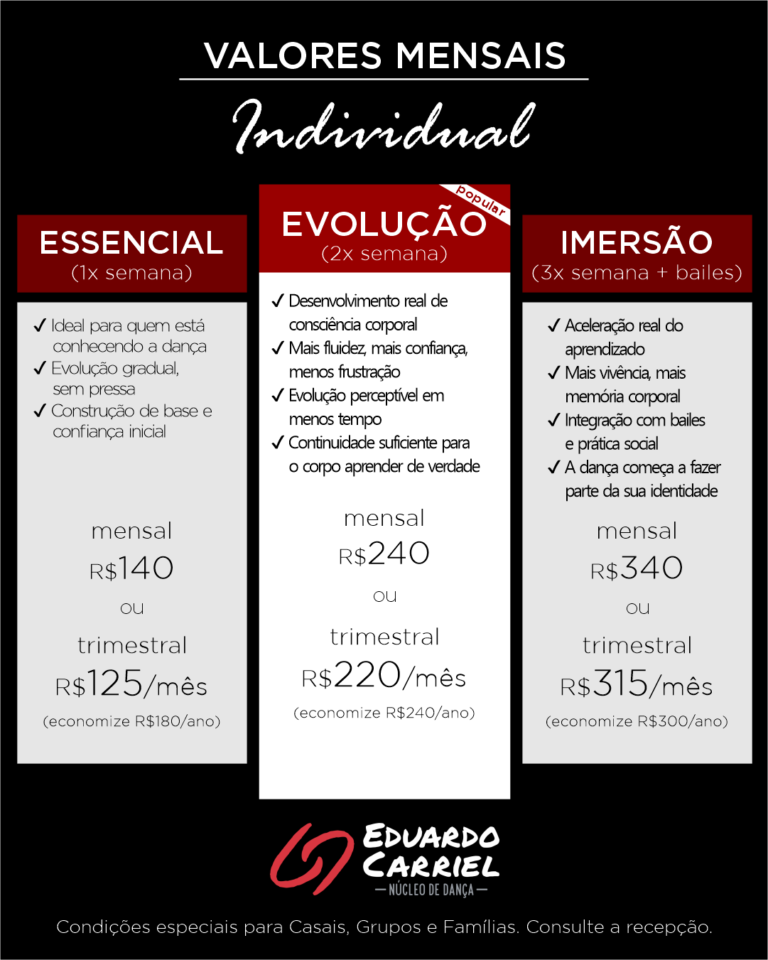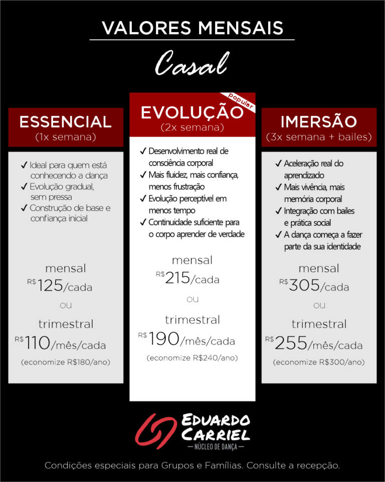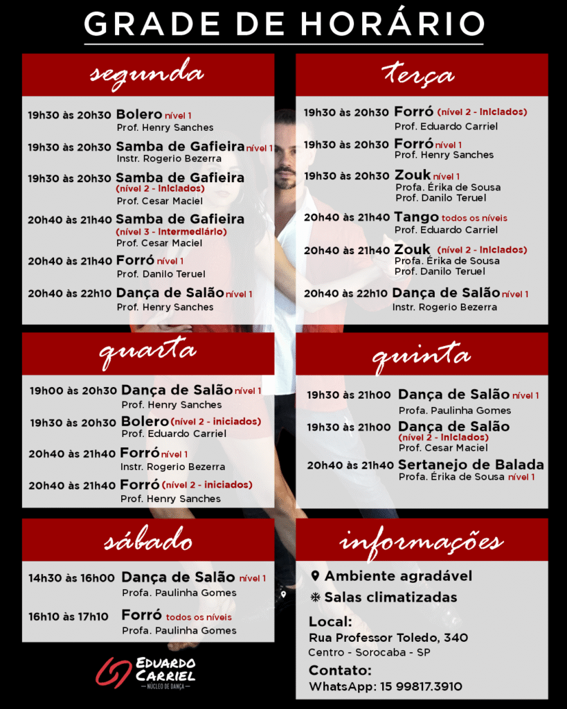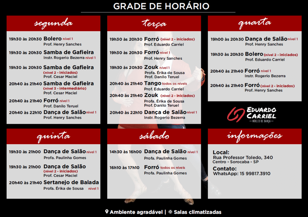 Com duração de 1h30, na aula de danças de salão você vai aprender os estilos mais dançados nos eventos e bailes: Forró, Bolero, Samba de Gafieira, Zouk, Bachata e Sertanejo.